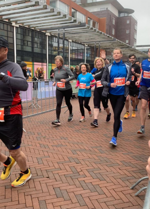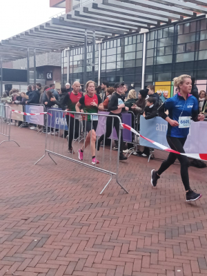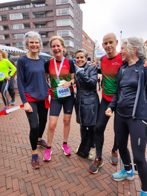 Marjan van Ginkel liep ook de halve marathon. Vorige week werd het clubrecord V55 zeer scherp gezet door Linda Jonker. Marjan ging hierdoor ambitieus maar veel te hard van start en zo werd het voor haar een zware race ... Dankzij de vele aanmoedigingen onderweg van haar loopmaatjes wist zij het toch vol te houden en verbeterde ze het clubrecord V55 naar 1:45:48. Marjan werd hiermee 3e op deze afstand in haar leeftijdscategorie.