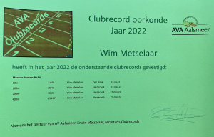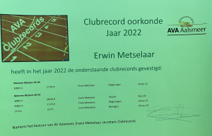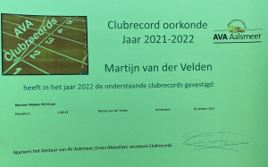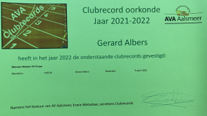 In de loop van 2023 zijn de certificaten uitgereikt aan de AVA-leden die in 2022 een clubrecord hebben gevestigd. Als eerste mocht Gerard Albers een certificaat in ontvangst nemen, nadat hij aan de woensdagochtendgroep training had gegeven. Gerard is natuurlijk niet meer zo snel als in z'n jonge jaren toen hij de marathon nog onder de 3 uur liep, maar wie van boven de 70 jaar kan nog een marathon lopen?