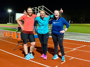 Vanaf rechts, Fiona Reed, Jolanda Wahlen en Roza de Groot kunnen nog lachen na hun 3km baanloop,