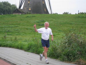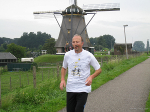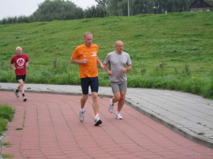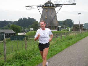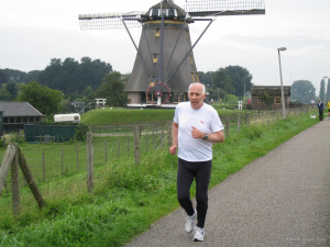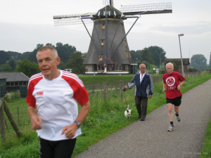 Ook de bekende veellopers Gijs Honing uit Blokker (al 287 marathons!) en Hans Buis uit De Rijp (247 marathons) pakten in een iets minder hoog tempo 12 rondjes Molenvliet mee.